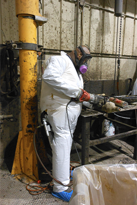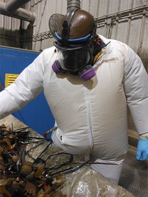 stripping areas. Our workers wear protective gear including coveralls and respirators to protect